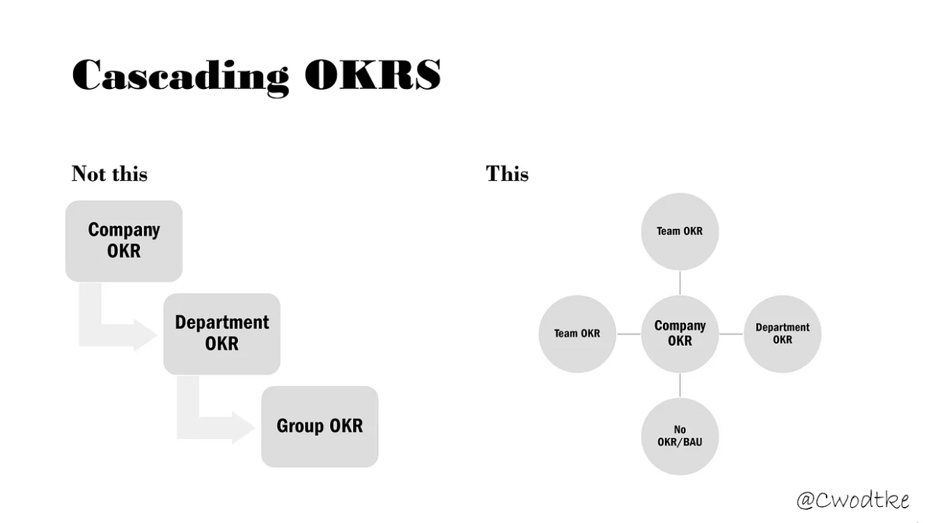 Matt connected this recommendation to Christina Wodtke’s point that in larger organizations the use of OKRs as a long cascade of goals can often be the source of “disconnected” team goals. And that instead of cascading goals, it helps if team goals are directly connected to company goals.